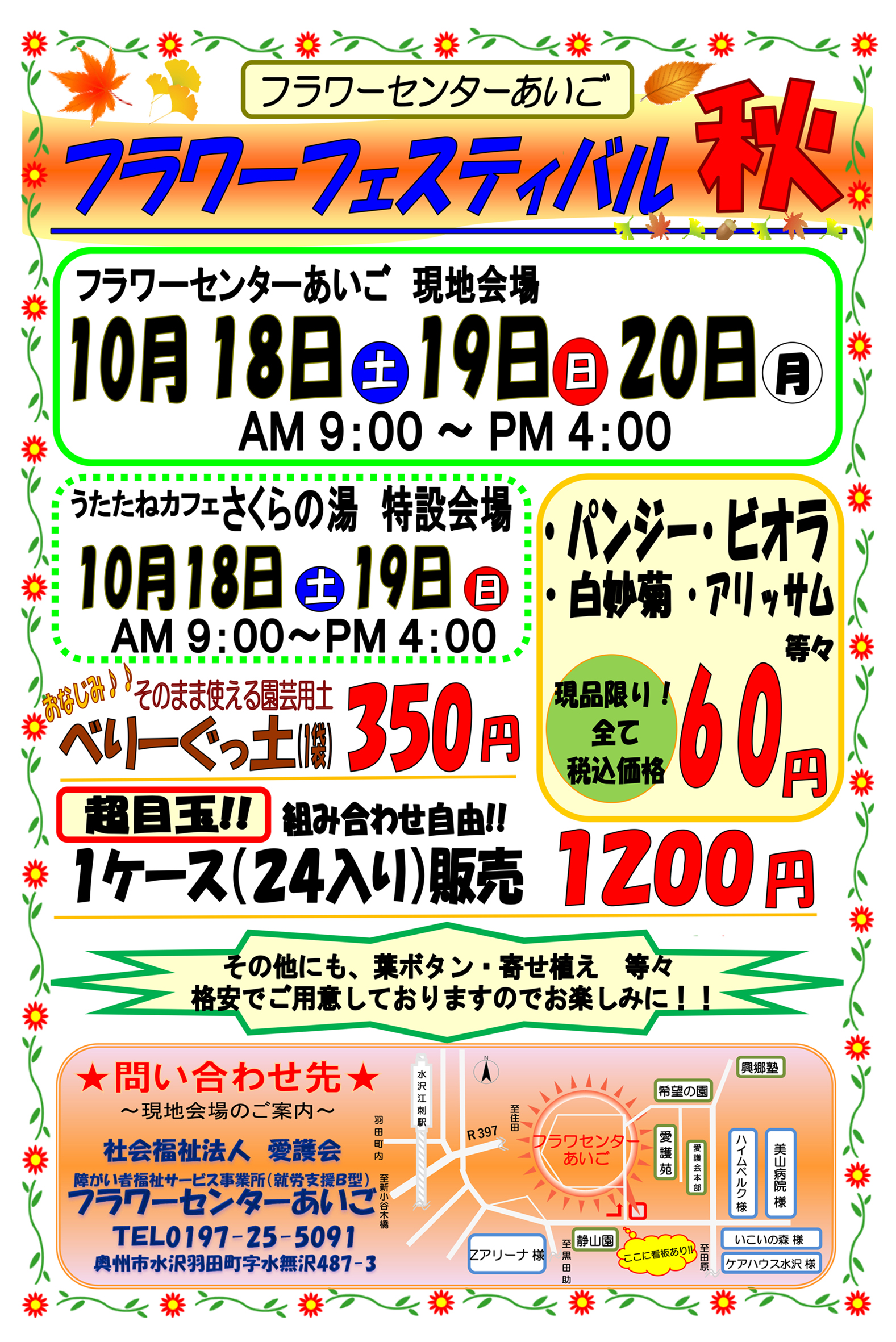 🎪フラワーセンターあいご 現地会場 🎪うたたねカフェさくらの湯 特設会場 秋の花苗各種を取り揃えて、皆様のご来場お待ちしております 🙂 ↓ うたたねカフェさくらの湯会場 |